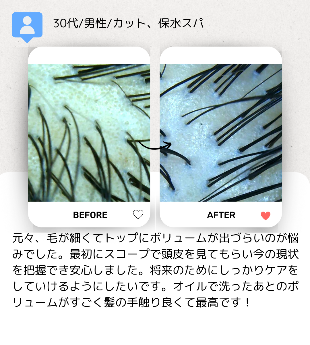 まずは、ご自宅でのシャンプーとトリートメント剤を見直して頂いております。ドラックストアで販売しているシャンプー剤は『石油系』または『硫酸系』と呼ばれるものが多く、頭皮トラブル(抜け毛、薄毛、痒み、皮膚炎など)がある頭皮に対して毎日ご使用になるには刺激が強すぎる傾向にあります。頭皮や毛髪の必要な皮脂を奪ってしまう事で、過剰な皮脂分泌が起こったり逆に乾燥化が進んでしまいまい、改善が遅れてしまいます。当店ではお客様のライフスタイルを考慮した上でできるケアからご提案させて頂きます。医薬部外品のものやしっかり結果重視の製品を取り揃えてありますのでご相談下さい。